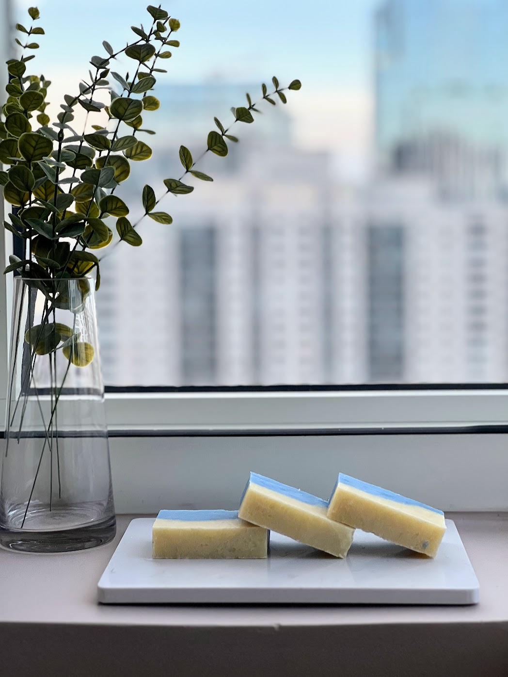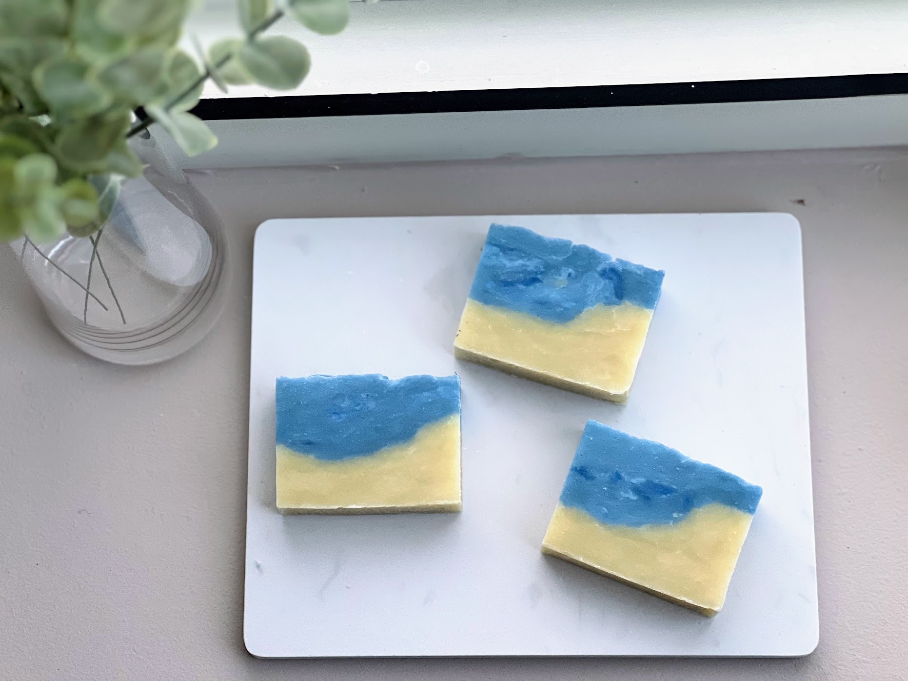 Ingredients: Saponified Oils (Olive Oil, Organic Palm Oil**, Organic Coconut Oil*, Organic Shea Butter*), Fragrance, Ultramarines, Turmeric Powder. **Fair Trade, Sustainable-Palm Done Right, *Fair Trade